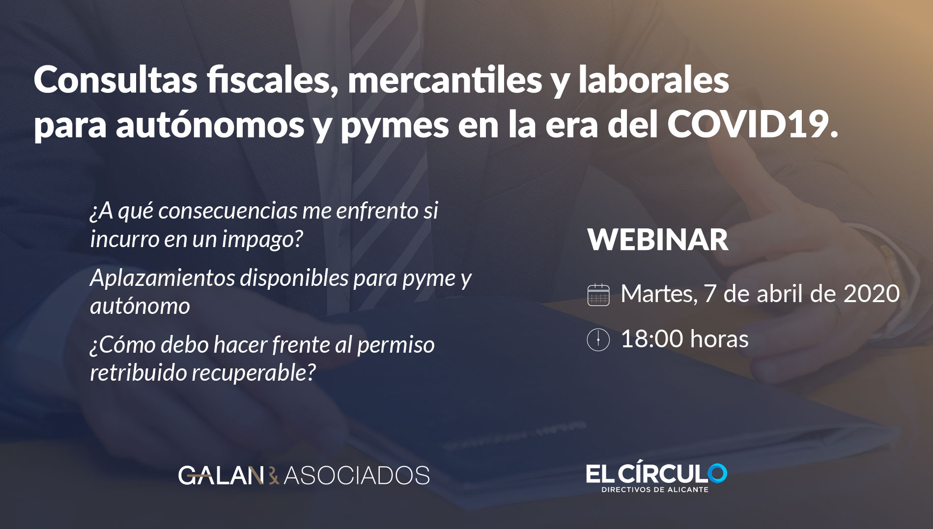Desde el El Círculo-Directivos de Alicante queremos sentirnos cerca de ti en estos momentos tan difíciles y dar respuesta a todas las cuestiones que como empresa o autónomo necesitas resolver. Para ello te proponemos un webinar práctico y cercano de la mano de los responsables de las áreas Legal, Laboral y Fiscal de la consultora profesional Galán&Asociados que atenderán todas tus consultas para tratar de paliar la incertidumbre (economómica) derivada de la crisis del Coronavirus.