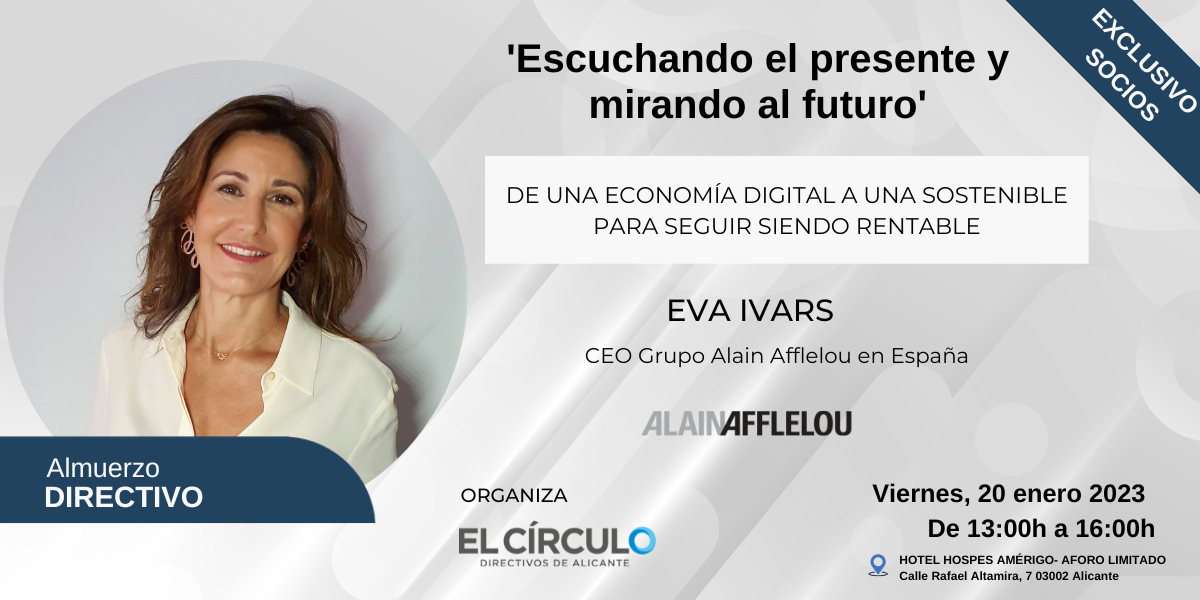 El Círculo-Directivos de Alicante organiza una nueva sesión de Almuerzos Directivos, en el marco del intercambio de información y networking de calidad, un encuentro exclusivo para asociados que tendrá como protagonista a Eva Ivars, CEO de Alain Afflelou España. El almuerzo tendrá lugar el próximo viernes 20 de enero, de 13:00h a 16:00h en el Hotel Hospes Américo (calle Rafael Altamira -Alicante).