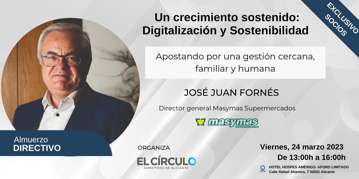 El Círculo-Directivos de Alicante organiza una nueva sesión de Almuerzos Directivos, en el marco del intercambio de información y networking de calidad, un encuentro exclusivo para asociados que tendrá como protagonista a José Juan Fornés, director general de Masymas Supermercados. El almuerzo tendrá lugar el próximo viernes 24 de marzo, de 13:00h a 16:00h en el Hotel Hospes Amérigo (calle Rafael Altamira -Alicante).