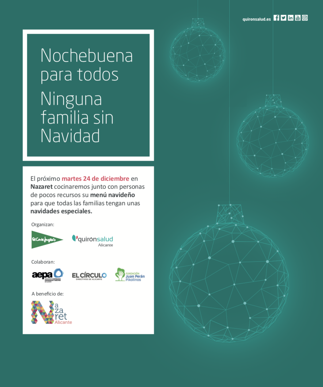 El Círculo – Directivos Alicante participa en la acción solidaria ‘Nochebuena para todos, ninguna familia sin Navidad’, en beneficio de la ONG Nazaret, impulsada por Quirónsalud Alicante en la que colabora El Corte Inglés, la Asociación de Empresarias, Profesionales y Directivas de la Provincia de Alicante (AEPA) y el Diario Información.