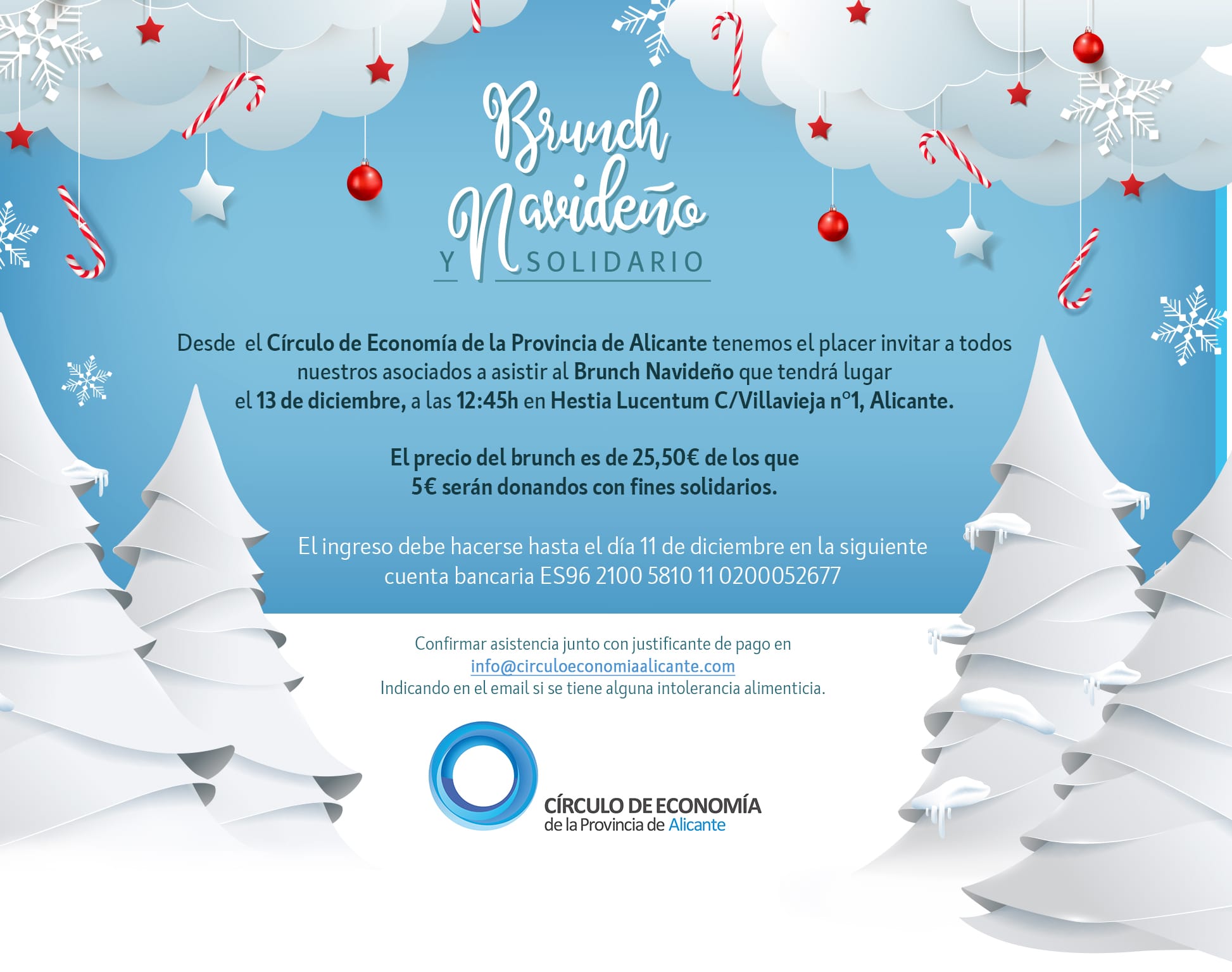 El Círculo de Economía de la Provincia de Alicante tiene el placer de invitar a todos los asociados a asistir al Brunch Navideño y Solidario que tendrá lugar el viernes, 13 de diciembre, a las 12:45h en Hestia Lucentum (C/ Villaviaje, 1, Alicante).