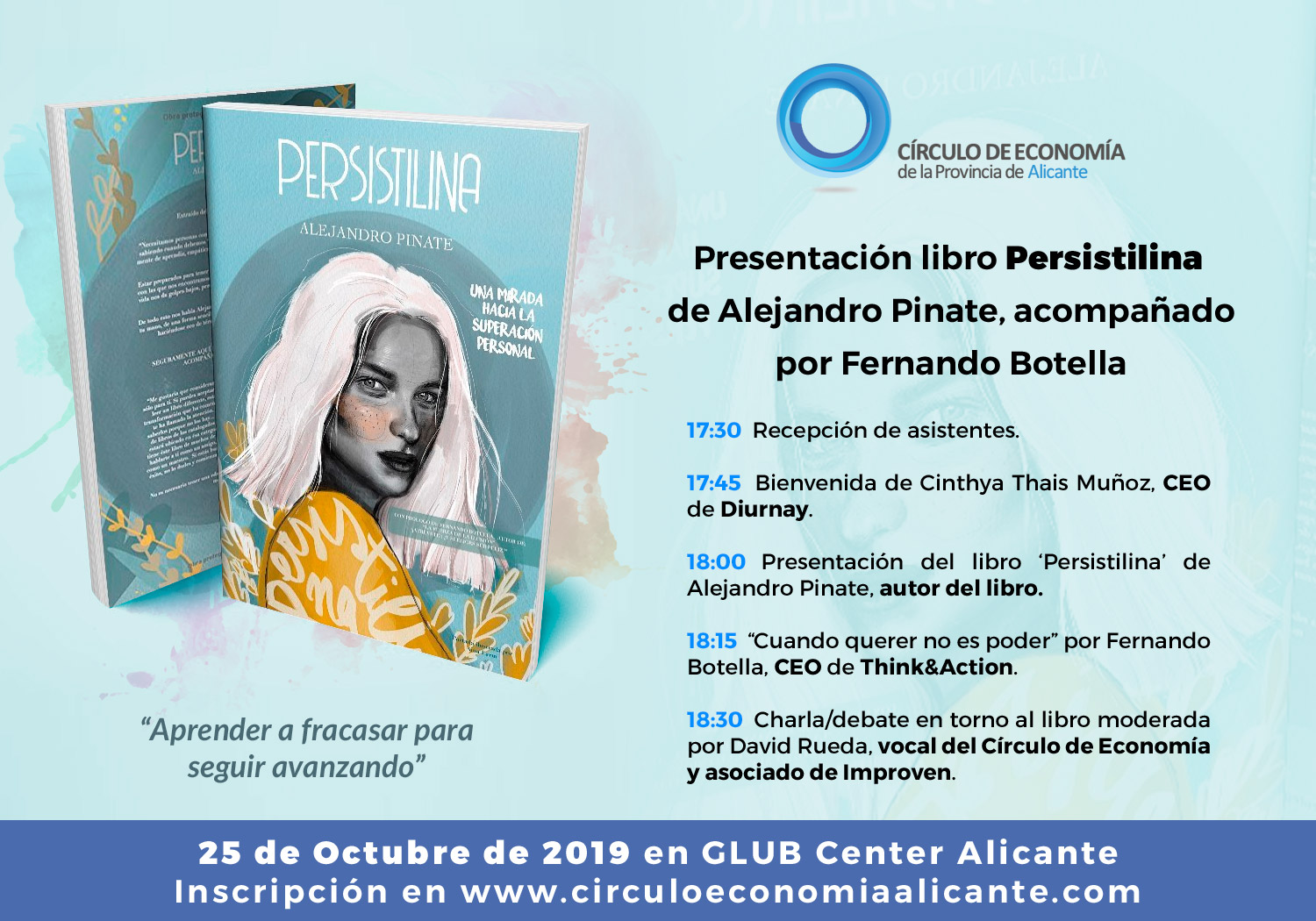 El Círculo de Economía de la Provincia de Alicante presenta, en el marco del ciclo #TardesQueInspiran, Persistilina, un libro de Alejandro Pinate que estará acompañado por Fernando Botella, coach en transformación digital y talento y CEO de Think&Action.