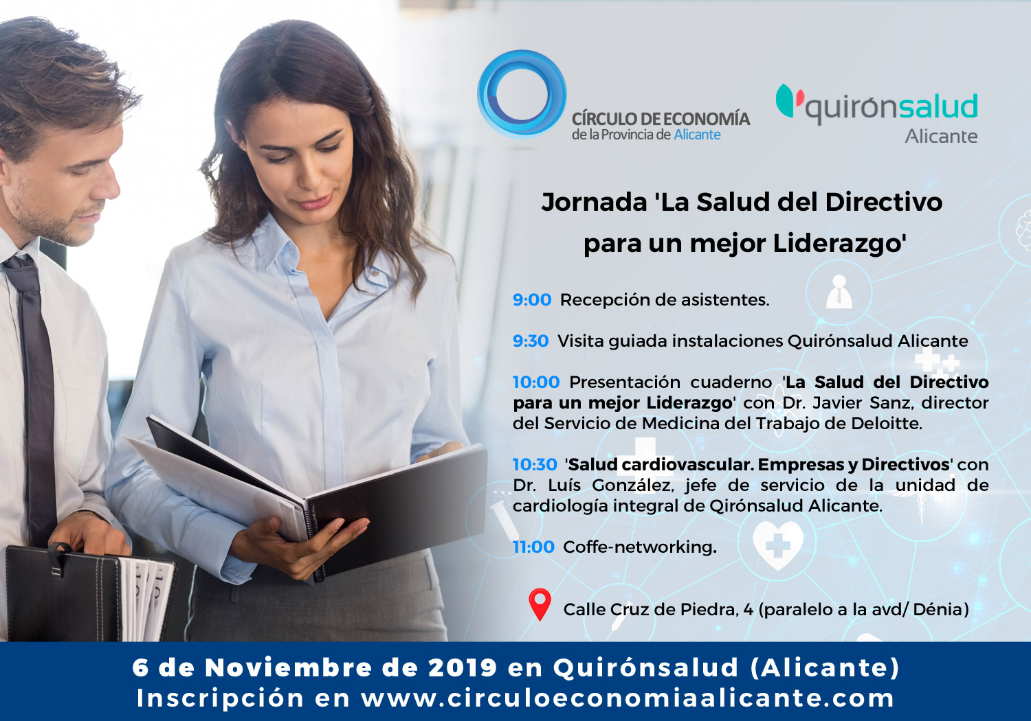 El Círculo de Economía de la Provincia de Alicante y Quirónsalud Alicante organizan el próximo 6 de noviembre, a las 9:00h, el desayuno de Alta Dirección ‘La Salud del directivo para un mejor liderazgo’, en el Centro Médico Quirónsalud Alicante (c/ Cruz de Piedra, 4 -paralelo a la avenida de Dénia-).