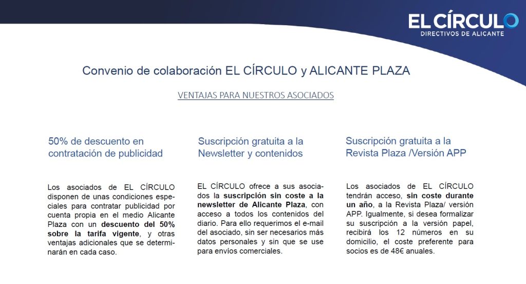 El diario Alicante Plaza redobla su compromiso con los colectivos y asociaciones empresariales de la provincia, con el objetivo de potenciar la actividad empresarial y la recuperación. Una iniciativa del diario en la que se ha apostado por interactuar con los actores principales del tejido empresarial de la provincia. Para ello, acaba de firmar un acuerdo de colaboración con El Círculo-Directivos de Alicante.