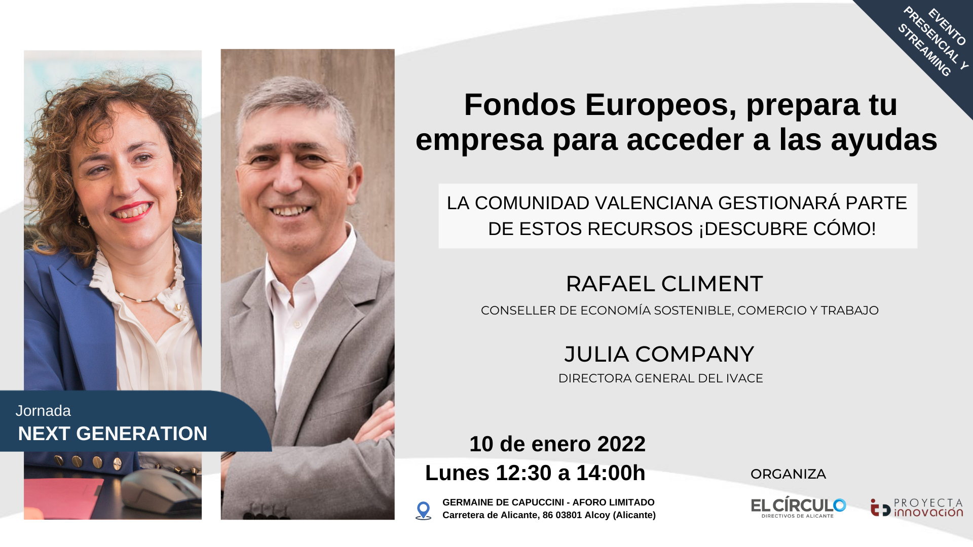El objetivo de estos fondos es, además de paliar los daños causados por la pandemia, avanzar hacia un modelo económico más sostenible y resiliente, siguiendo las pautas y las prioridades digitales y ecológicas marcadas desde Bruselas. En este sentido, y conscientes de la importancia de que las pymes conozcan al detalle todos los requisitos para adaptar su proyectos a las exigencias impuestas por Europa para acceder a estos fondos, El Círculo-Directivos de Alicante y Proyecta Innovación organizan la jornada informativa ‘Fondos Europeos, prepara tu empresa para acceder a las ayudas’, el próximo lunes, 10 de enero, a las 12:30h, en las instalaciones de Germaine de Capuccini (Carretera de Alicante, 86 -03801, Alcoy-).