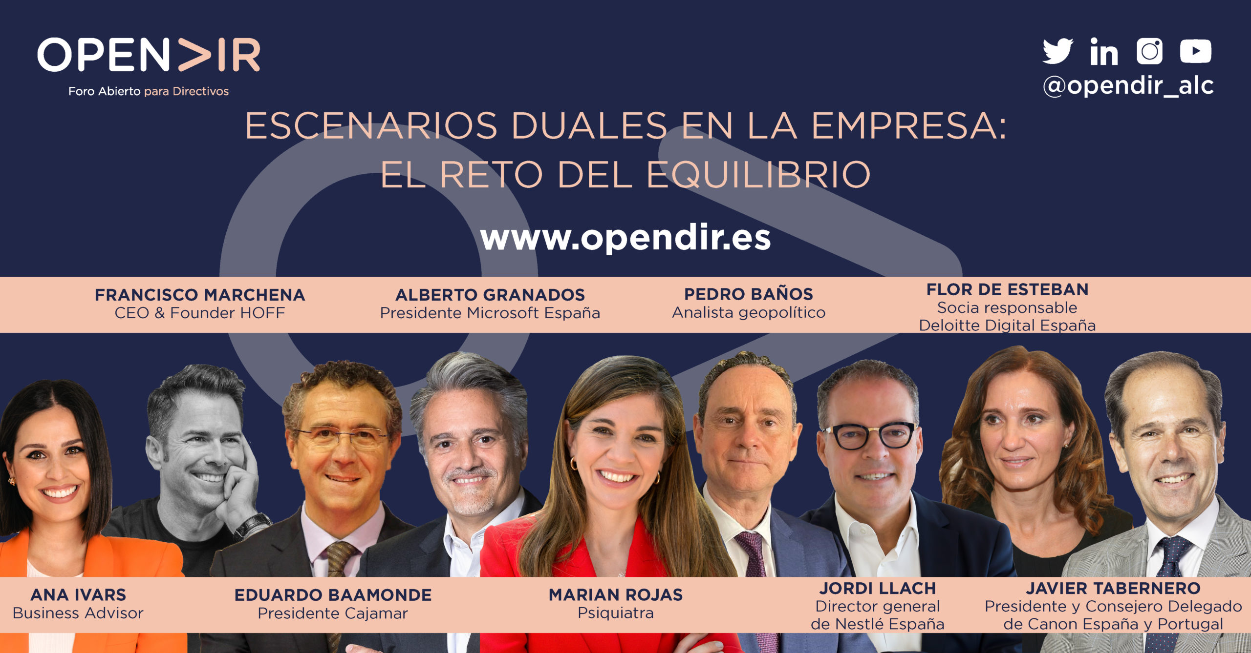 OPENDIR se celebra con el claim “Escenarios duales en la empresa: el reto del equilibrio” y tiene el objetivo de proporcionar a los asistentes información útil y de calidad con la participación de la alta dirección de empresas – entre presidentes, CEOs o directores generales- de ámbito nacional e internacional. Los temas que se abordan son de máxima actualidad e incluyen la digitalización, economía, gestión, bienestar emocional, la sostenibilidad o la internacionalización.