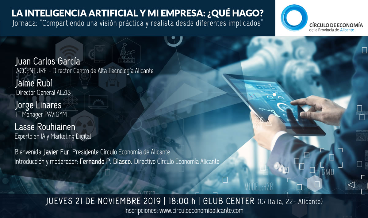 El Círculo de Economía de la Provincia de Alicante organiza el próximo jueves, 21 de noviembre, a las 18:00h en Glub Center (c/Italia nº22) la jornada: ‘La Inteligencia Artificial (IA) y mi empresa: ¿qué hago?’, dirigida a empresarios y directivos implicados en la estrategia, el desarrollo tecnológico de su compañía y el impacto de su entorno,