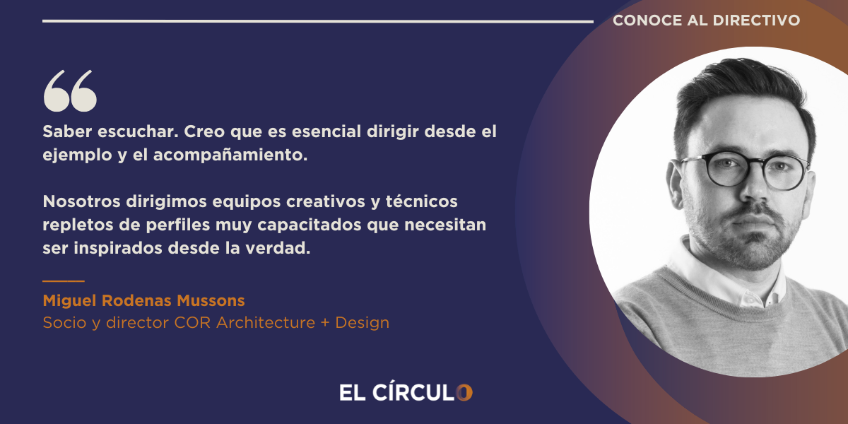 El Círculo-Directivos de Alicante continúa con la sección «Conoce a la persona detrás del directivo», un espacio en el que compartimos la experiencia de nuestros directivos para inspirarnos, conocer su historia y el camino que les ha llevado a ser líderes exitosos. Hoy hablamos con Miguel Rodenas Mussons, socio y director COR Architecture + Design.