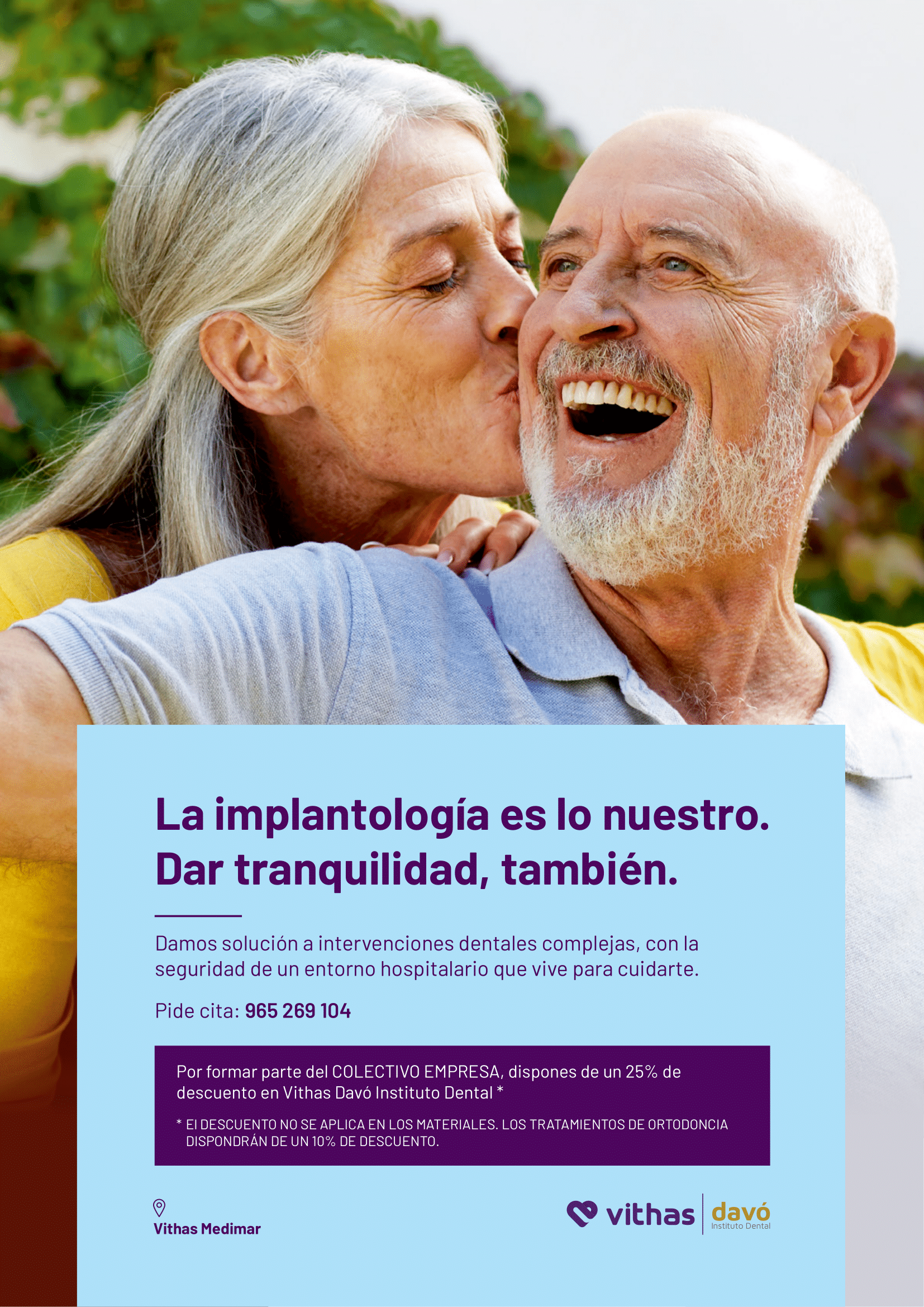 Los Hospitales Vithas de Alicante te ofrecen por ser socio de El Círculo y formar parte del COLECTIVO EMPRESA, un 25% de descuento en Vithas Davó Instituto Dental. Pide cita llamando al 965 269 104.