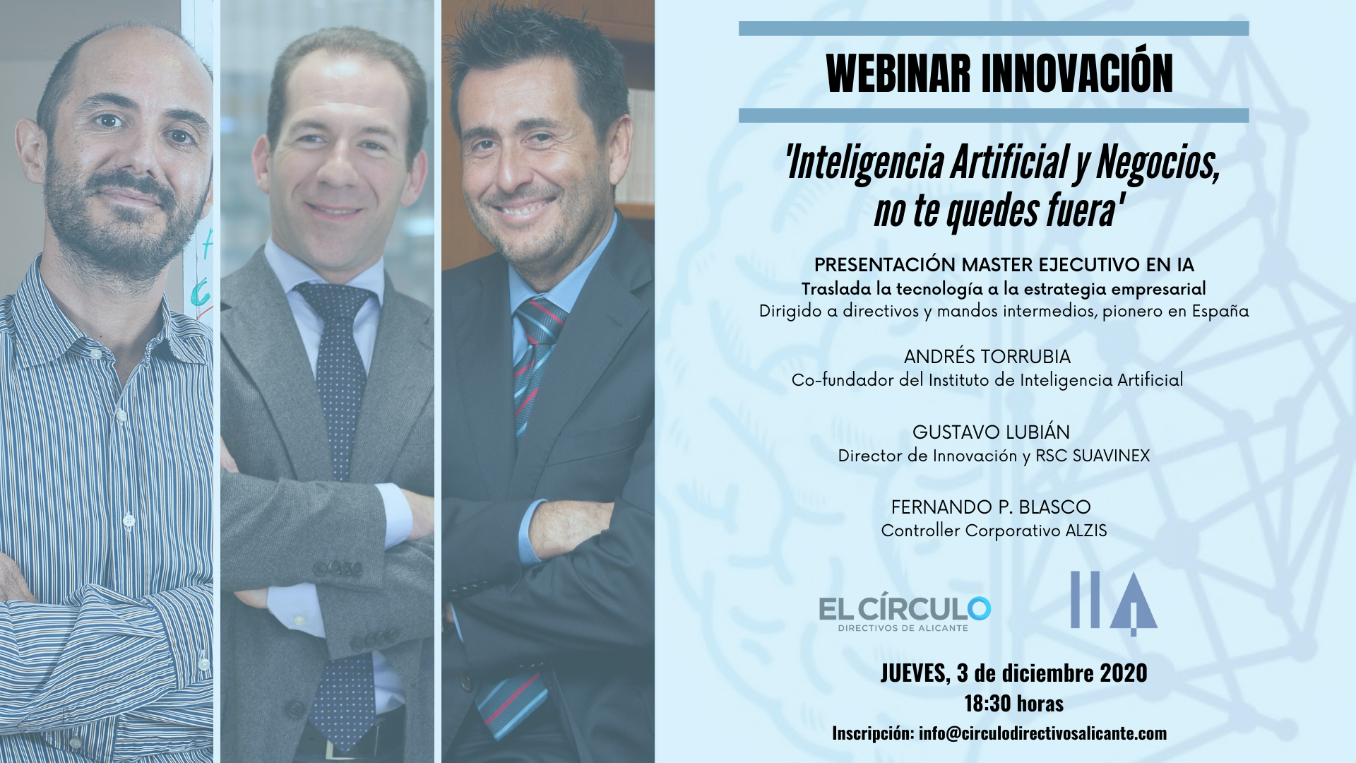 ¿Cómo impacta la Inteligencia Artificial en mi modelo de negocio y el ecosistema empresarial que me rodea? ¿Qué beneficios puede dar, cuánto cuesta implantarla y quién es responsable de ello en una organización? El Círculo-Directivos de Alicante organiza el webinar ‘Inteligencia Artificial y Negocios, no te quedes fuera’ con Andrés Torrubia, cofundador del Instituto de Inteligencia Artificial, el próximo jueves, 3 de diciembre, a las 18:30h, en formato on-line.
