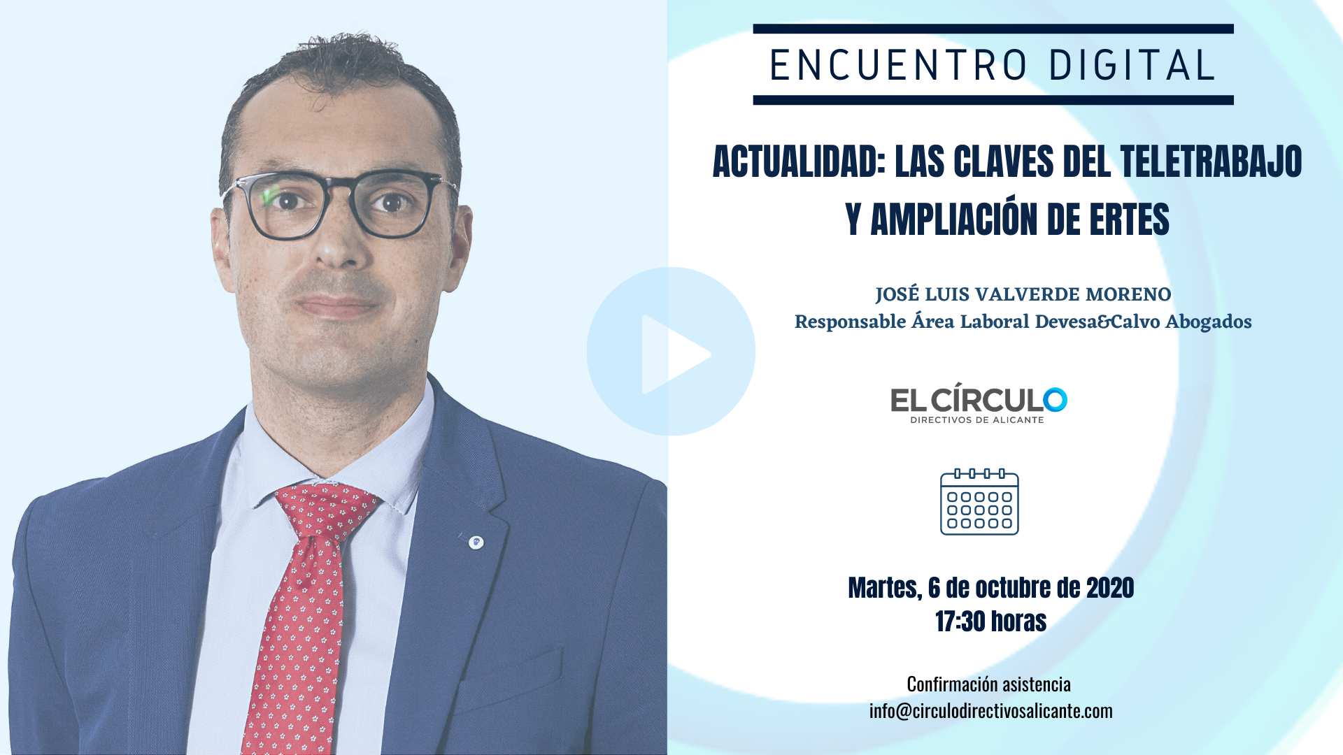 El teletrabajo ha llegado para quedarse, y la regulación de este nuevo modelo de relacionarse con tu empresa y empleados así lo demuestra. Aunque en la práctica todos sabemos de qué hablamos cuando nos referimos a teletrabajar, la aplicación todavía deja muchas dudas en el aire ¿puedo negarme a teletrabajar en mi jornada laboral? ¿esa decisión es reversible? ¿quién corre con los costes técnicos generados de trabajar en casa? Una situación que todavía no afecta a aquellos empleados que siguen en ERTE y que, tras su ampliación hasta el 31 de enero, deben conocer cuáles son las nuevas reglas del juego. El Círculo-Directivos de Alicante y nuestro asociado Devesa&Calvo Abogados responderán a todas las cuestiones que ahora te preocupan, como empresario, autónomo o empleado, a través del webinar ‘Las claves del Teletrabajo y ampliación de los ERTES’ el próximo martes, 6 de octubre, a las 17:30h, de la mano de José Luis Valverde (responsable del Área Laboral de Devesa&Calvo).