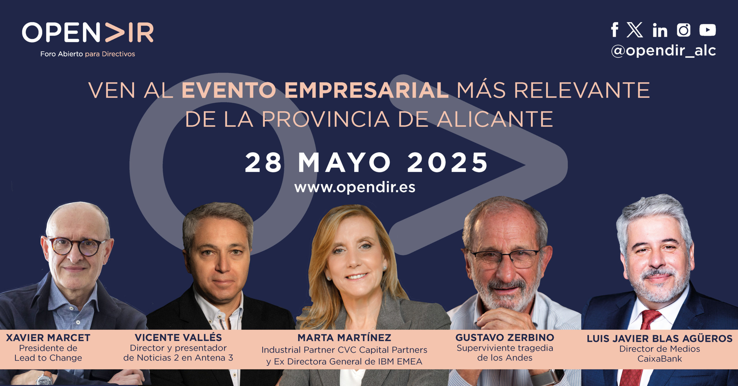 OPENDIR | Foro abierto para directivos, el encuentro de referencia en Alicante para directivos y empresarios ha anunciado cinco nuevos ponentes para el evento que se celebra el próximo 28 de mayo en el ADDA de la capital alicantina, con la previsión de reunir a 1.200 asistentes.