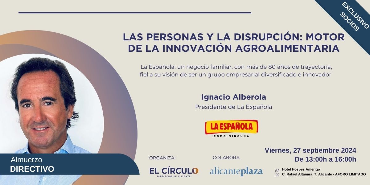 El Círculo-Directivos de Alicante retoma los Almuerzos Directivos, en el marco del intercambio de información y networking de calidad, un encuentro exclusivo para asociados que tendrá como protagonista a Ignacio Alberola, presidente de La Española. El almuerzo tendrá lugar el próximo viernes 27 de septiembre, de 13:00h a 16:00h, en el Hotel Hospes Amérigo (C. Rafael Altamira, 7, Alicante).