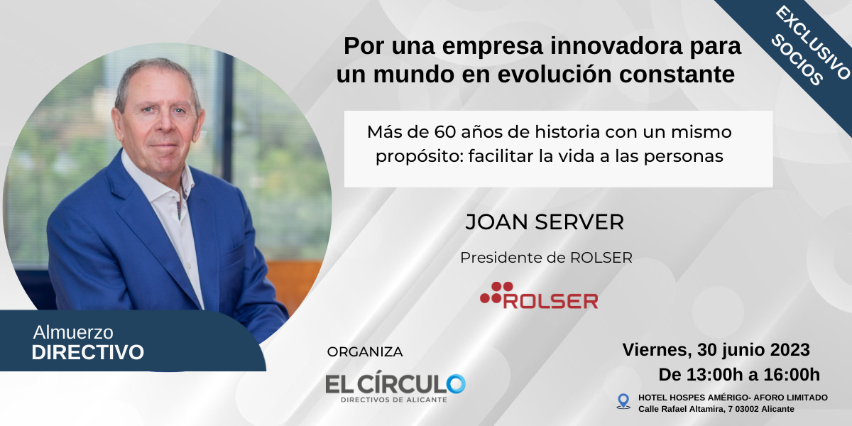 El Círculo-Directivos de Alicante organiza una nueva sesión de Almuerzos Directivos, en el marco del intercambio de información y networking de calidad, un encuentro exclusivo para asociados que tendrá como protagonista a Joan Server, presidente de ROLSER. El almuerzo tendrá lugar el próximo viernes 30 de junio, de 13:00h a 16:00h en el Hotel Hospes Amérigo (calle Rafael Altamira -Alicante).