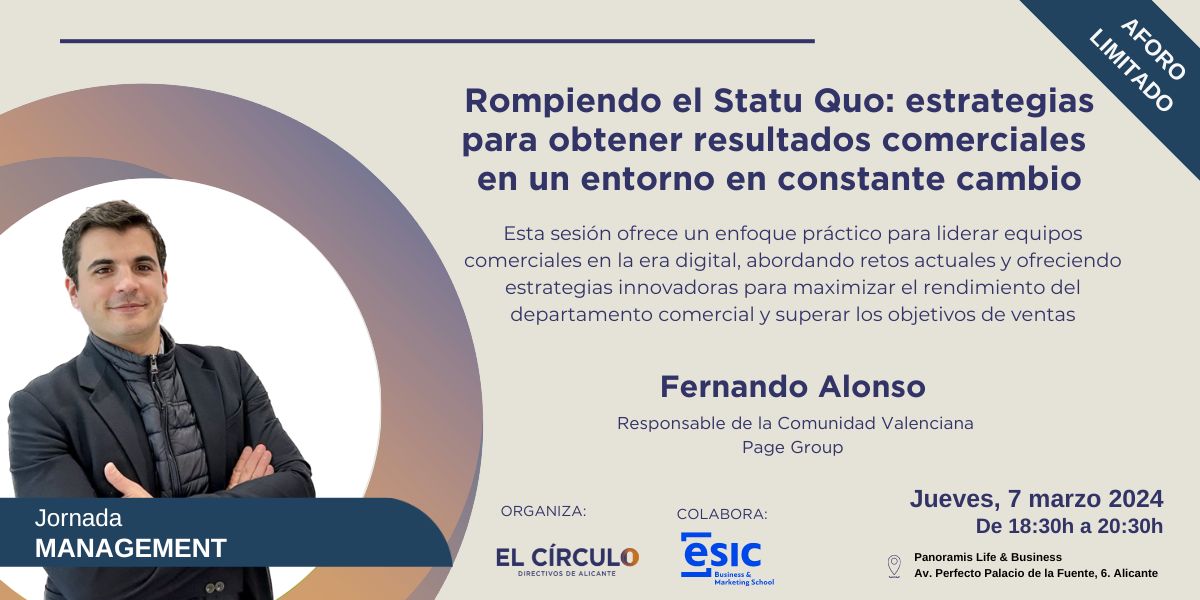 El Círculo-Directivos de Alicante junto a ESIC Business & Marketing School te invitan a participar en la jornada Rompiendo el Statu Quo: Estrategias para obtener resultados comerciales excepcionales en un mundo en constante cambio que se celebrará el próximo jueves 7 de marzo en Panoramis Life & Business a las 18:30h. Esta sesión Fernando Alonso, responsable de la Comunidad Valenciana en Page Group, ofrece un enfoque práctico para liderar equipos comerciales en la era digital, abordando retos actuales y ofreciendo estrategias innovadoras para maximizar el rendimiento del departamento comercial y superar los objetivos de ventas.