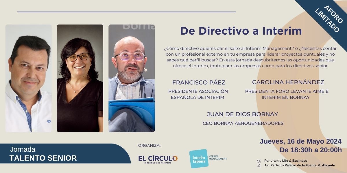 El Círculo Directivos de Alicante, en colaboración con la Asociación Interim Management España, impulsa, en el marco del ciclo formativo Segunda Carrera del Directivo Senior, la jornada ‘De Directivo a Interim’ el próximo jueves, 16 de mayo, a las 18:30h, en el Centro de Negocios Panoramis Life & Business (Avd/ Perfecto Palacio de la Fuente, 6). Una jornada en la que descubriremos las oportunidades que ofrece el Interim Management, tanto para las empresas como para los directivos senior.