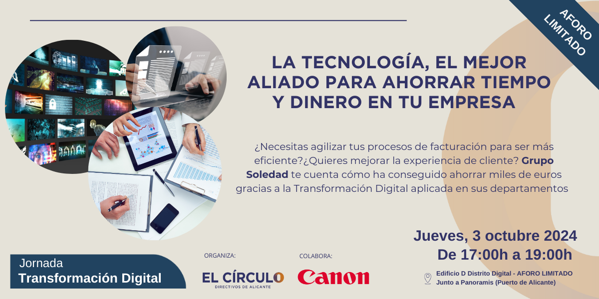 En este sentido, El Círculo- Directivos de Alicante, en colaboración con Canon, impulsan la jornada de Transformación Digital ‘La Tecnología, el mejor aliado para ahorrar tiempo y dinero en tu empresa’ el próximo jueves, 3 de octubre, a las 17:00h, en el edificio D de Distrito Digital (junto a Panoramis – Puerto de Alicante-). Un evento dirigido a directivos con el objetivo de que conozcan, de manera cercana y comprensible, cómo pueden automatizar su empresa, a través de aplicaciones en distintas áreas como el Dtpo. Financiero, de Recursos Humanos y PRL, Calidad, Operaciones y Logística y Seguridad.