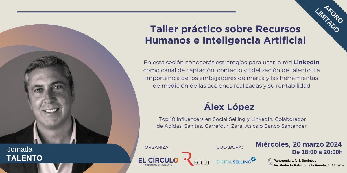 Taller práctico sobre RRHH e Inteligencia Artificial con Álex López, TOP 10 Influencers en LinkedIn | Miércoles, 20 de marzo, a las 18:00h ¡Inscríbete!